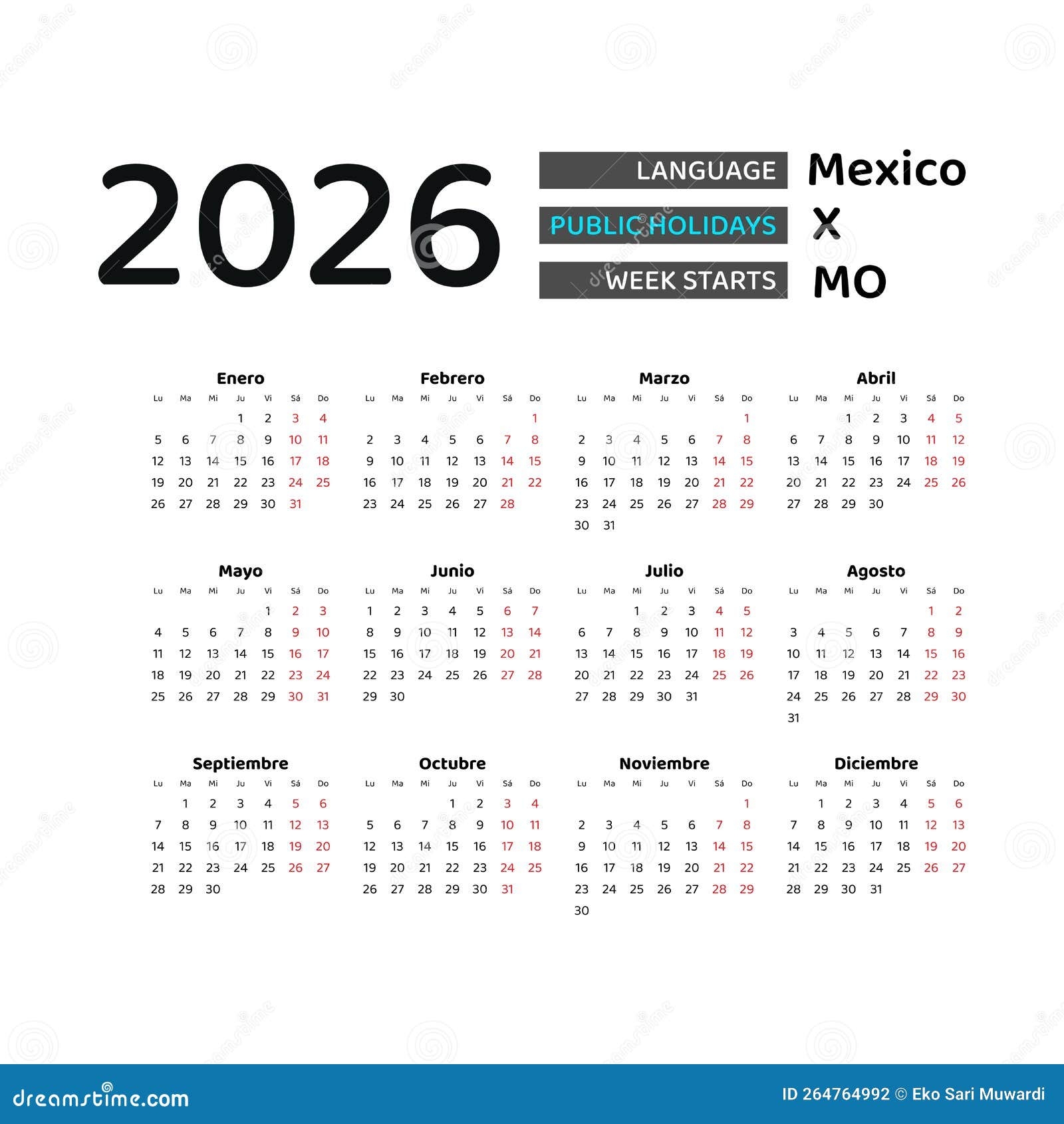 Mexico Calendar 2026 Week Starts From Monday Vector Graphic Design Stock Vector Illustration Of Printing Language 264764992