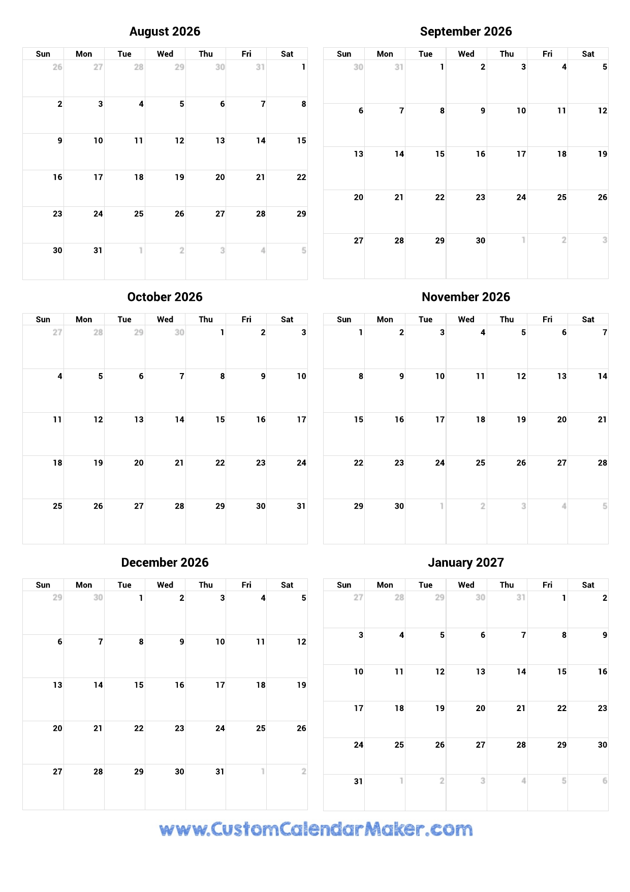 August 2026 To January 2027 Printable Calendar Custom Calendar Maker
