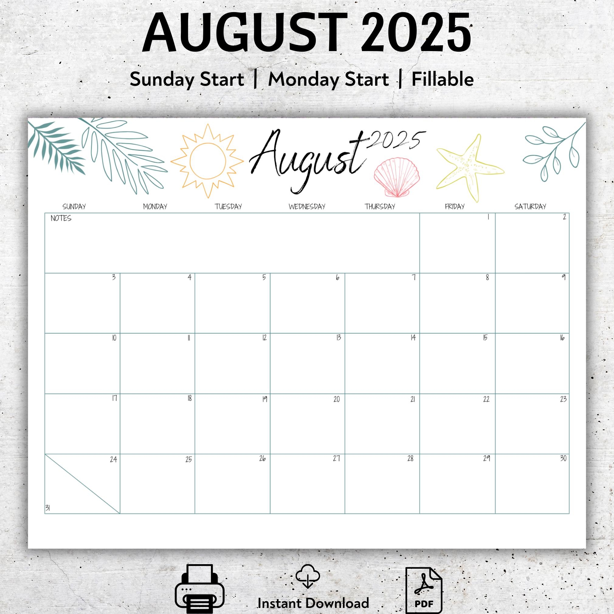 August 2025 Calendar Printable Minimalist Beach Design Editable PDF Template Sunday Or Monday Start Instant Download