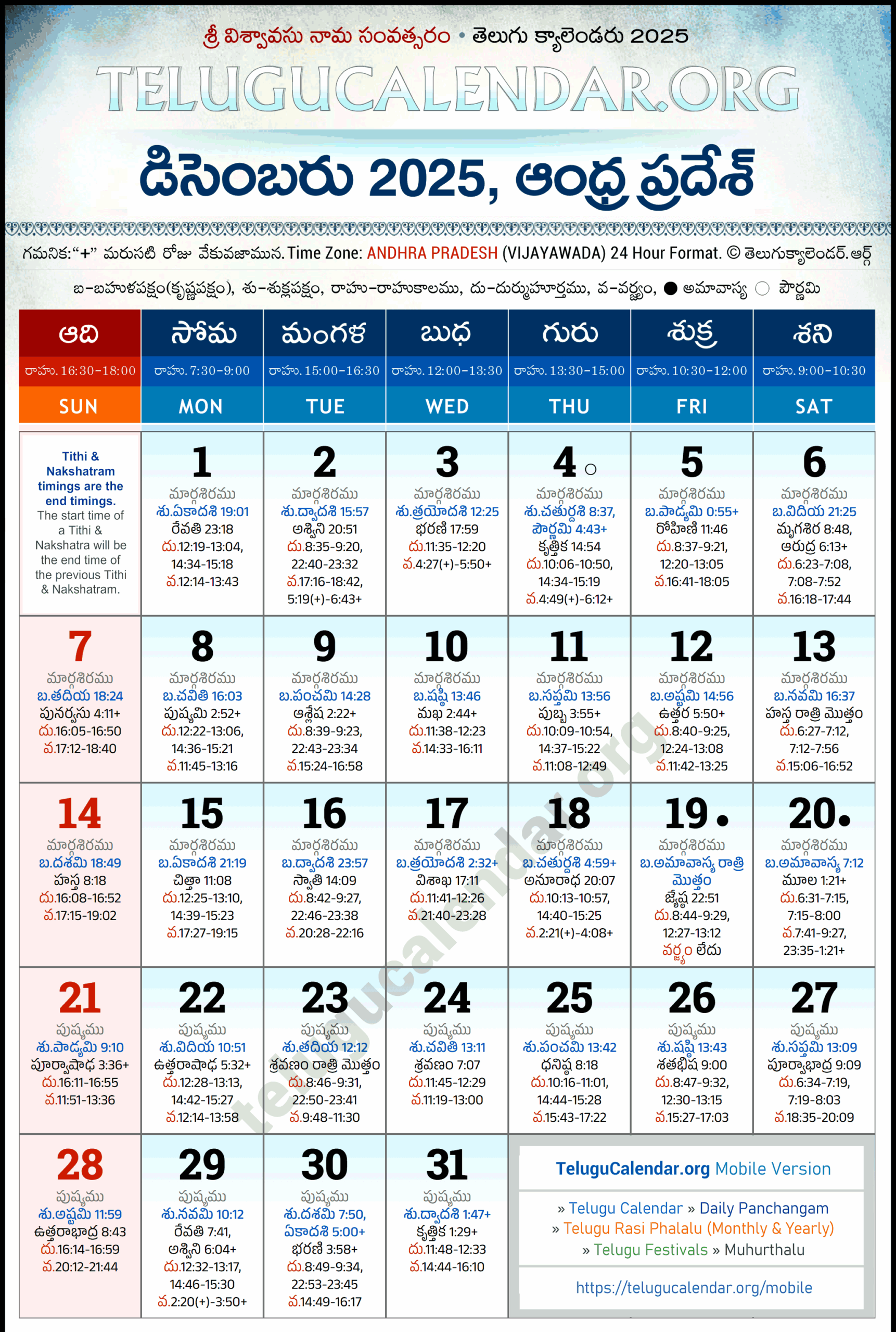 Telugu Calendar 2025 December