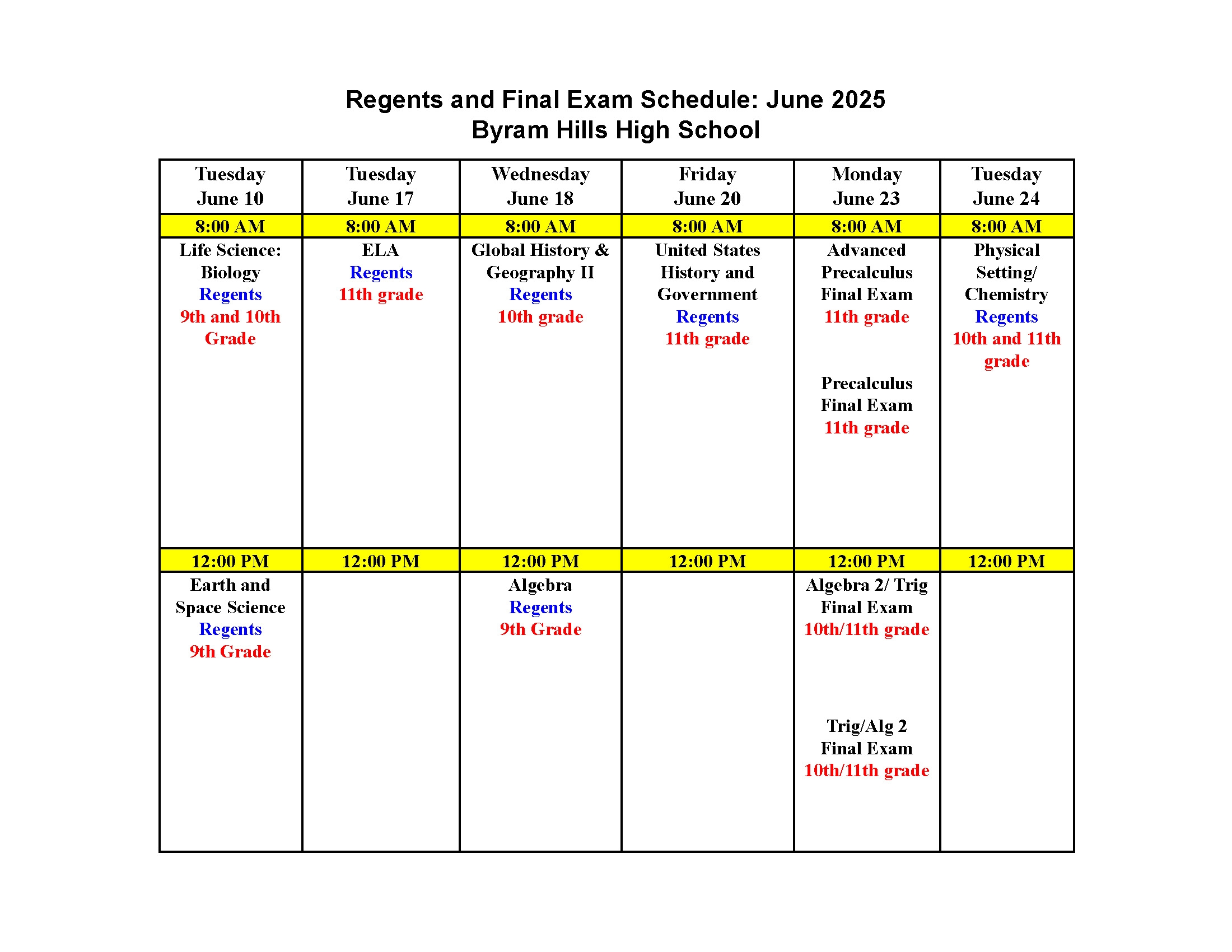 Regents U0026 Final Exam Schedule Byram Hills Central School District