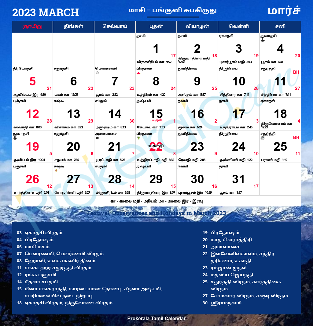 Start your month off right by consulting the March 2026 Tamil Calendar. From important religious observances to auspicious days for starting new ventures, this calendar has all the information you need to plan your month ahead.