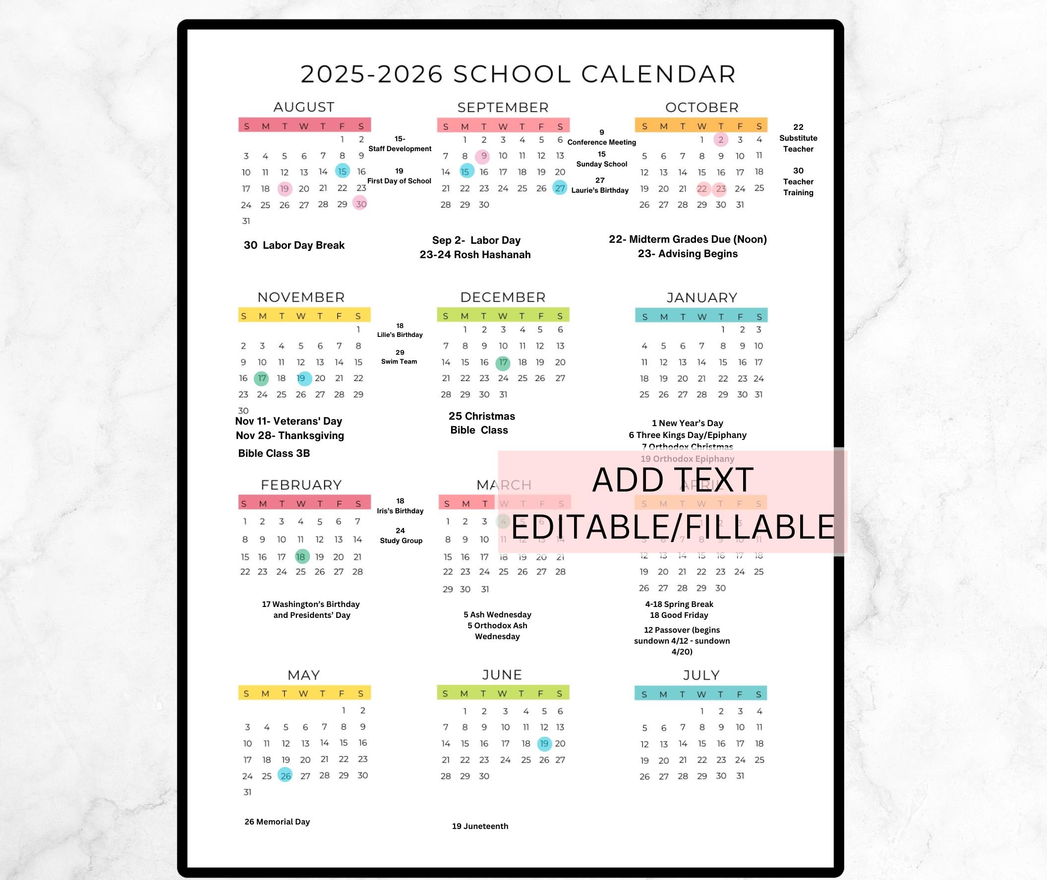 Editable School Year Calendar 2025 2026 School Calendar Printable 2025 2026 Academic Year At a glance Calendar Digital Download Preschool Etsy
