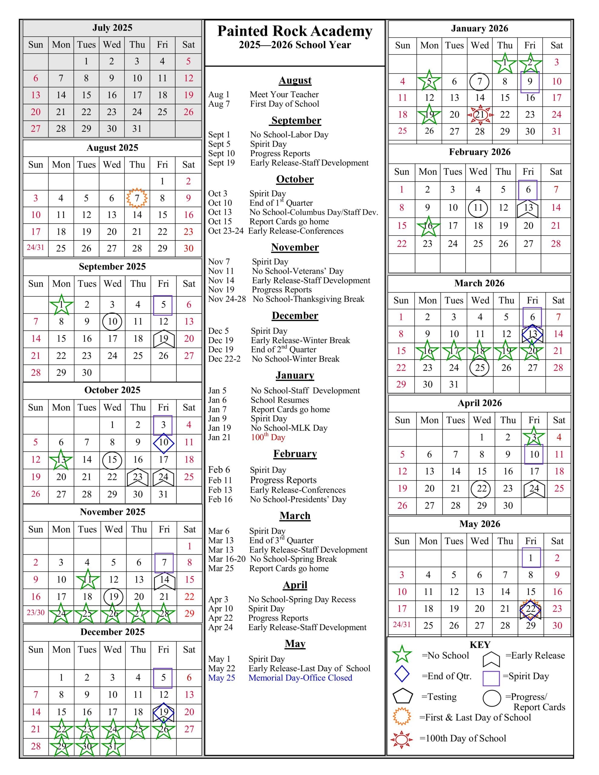 School Year Calendar 2025 2026 Painted Rock Academy