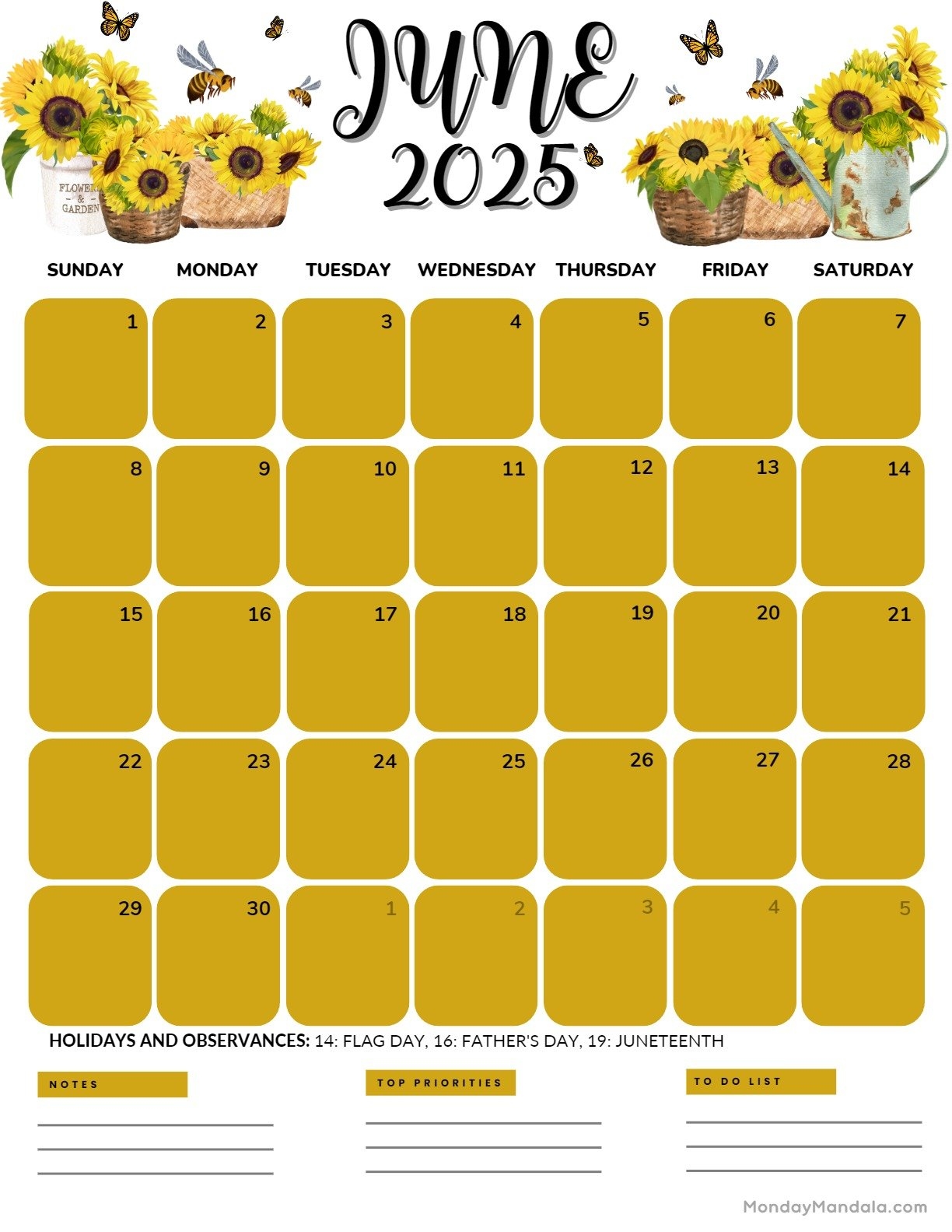 From marking important dates to jotting down to-do lists, the Sunflower June 2025 Calendar offers you a practical and stylish way to stay on top of your schedule. With ample space for notes and reminders, you can customize your calendar to suit your needs and preferences.